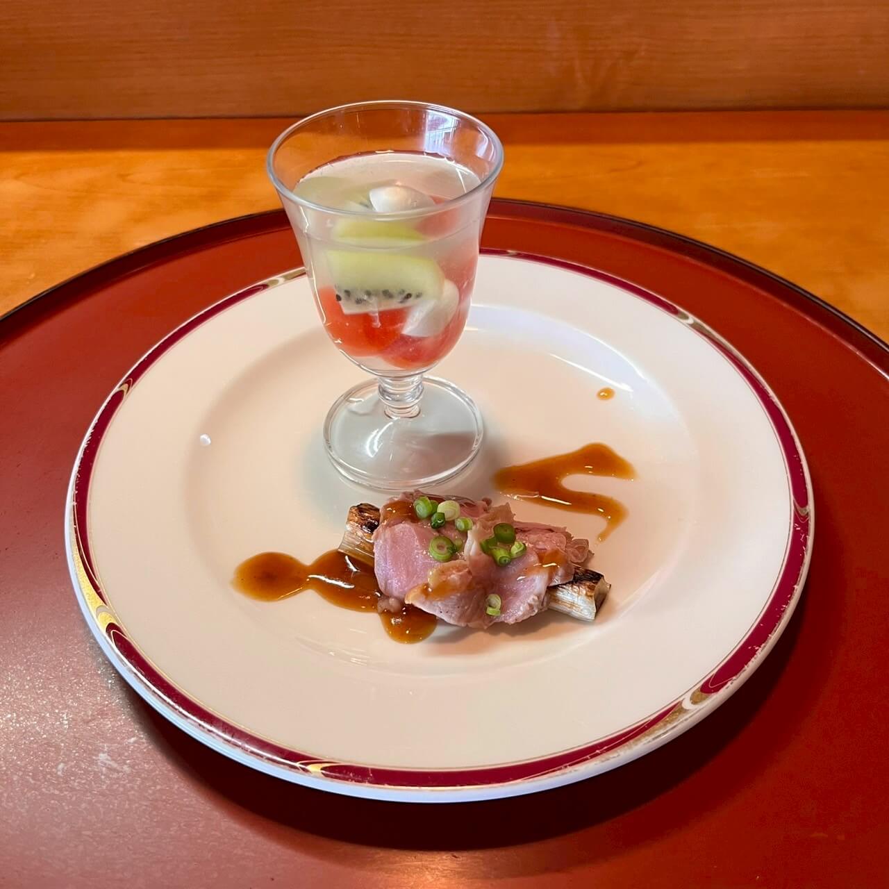 トマトとフレッシュモッツァレラの一口カクテル鴨肉と焼きネギ